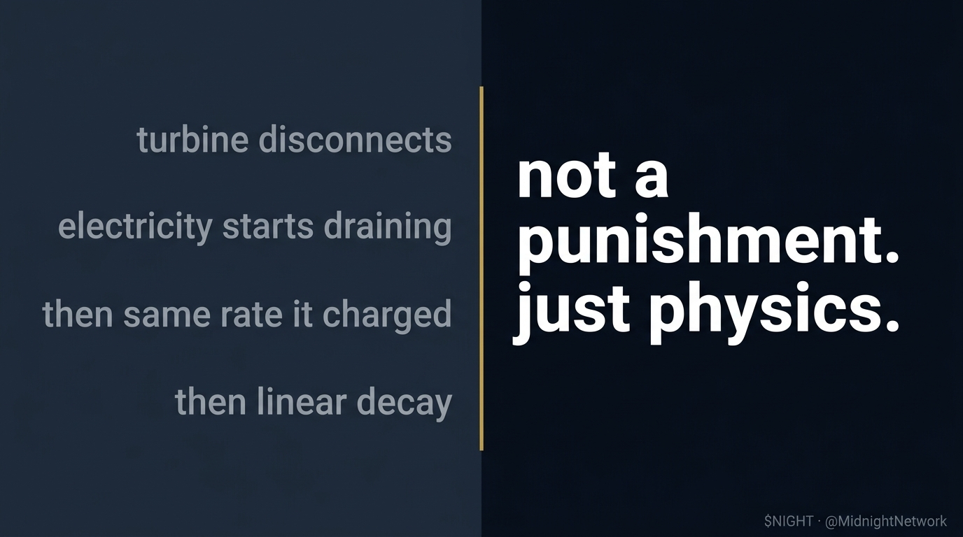 And when the turbine disconnects from the battery — when NIGHT is transferred away — the stored electricity starts to decay. it doesnt disappear instantly, it drains at the same rate it was being generated. the whitepaper describes this as a finite shelf life, decaying linearly at the same rate it was generated. this is the DUST decay mechanic — not a punishment, just physics.
