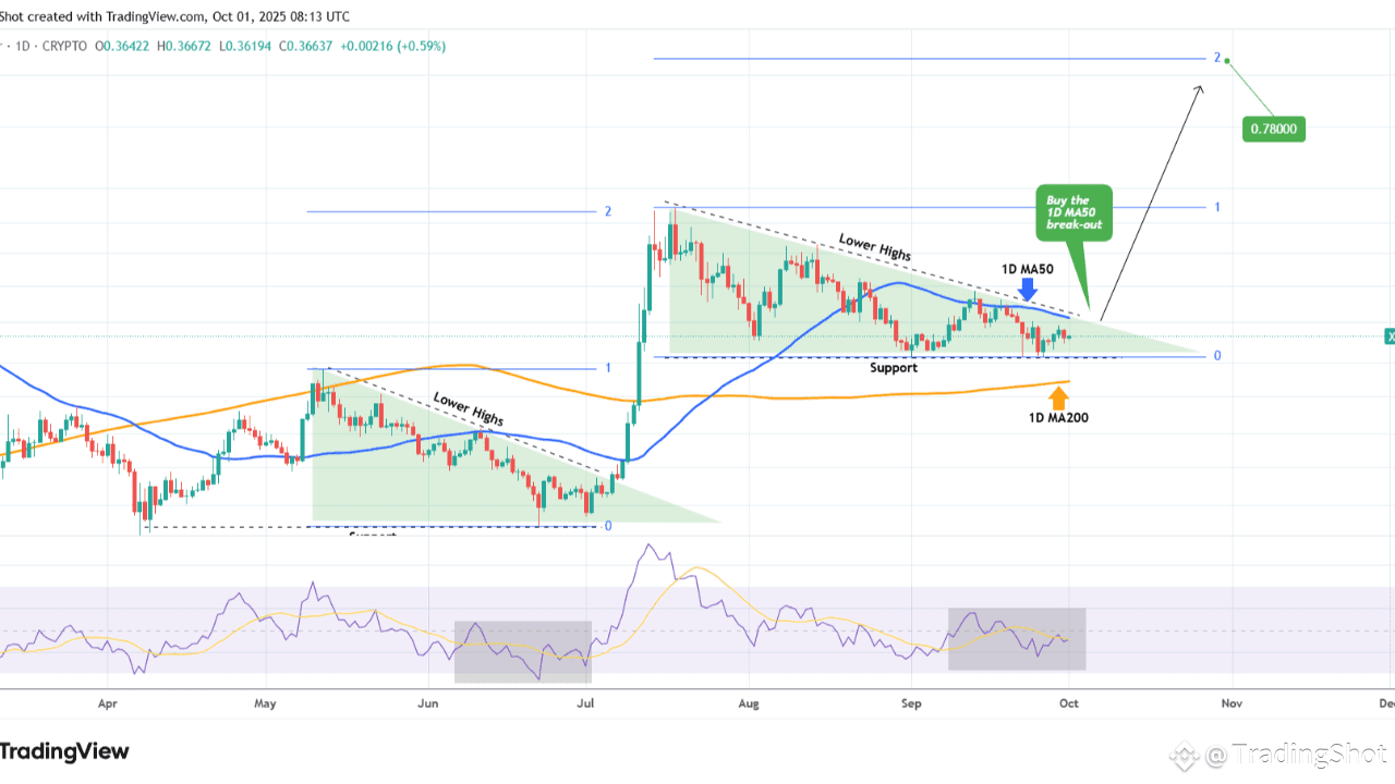 Stellar (XLMUSD) wird seit dem Hoch am 18. Juli innerhalb eines fallenden Dreiecks gehandelt und bewegt sich derzeit innerhalb seines Unterstützungsniveaus und der 1D MA50 (blaue Trendlinie).