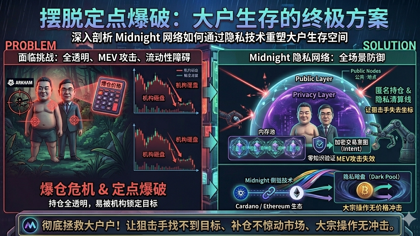 Verwendet die Midnight-Dual-Status-Ledger-Struktur (Public-Private Ledger). Lassen Sie große Investoren im Privacy-Layer von Midnight (basierend auf Zero-Knowledge-Proofs ZK-SNARKs) operieren, wobei ihre Bestände, Margin-Verhältnisse und Liquidationslinien für die Außenwelt völlig unsichtbar sind. Institutionen wissen nur, dass es Long-Positionen auf dem Markt gibt, wissen aber nicht, wo genau die Liquidation stattfindet, wodurch sie die Koordinaten für gezielte Liquidationen verlieren.