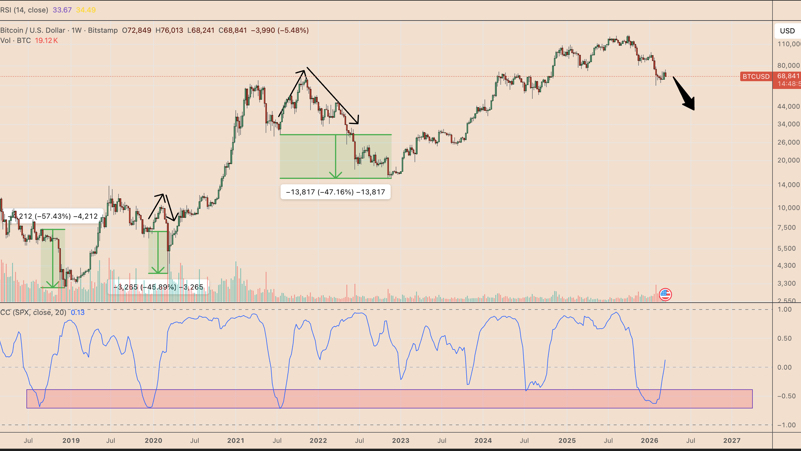 If this historical pattern repeats itself, a 50% haircut from current levels (~$68,700) would drag BTC down to the $34,000–$40,000 range. As analyst Tony Severino warned, this could be a sign that a broader stock market pullback might take BTC down with it.