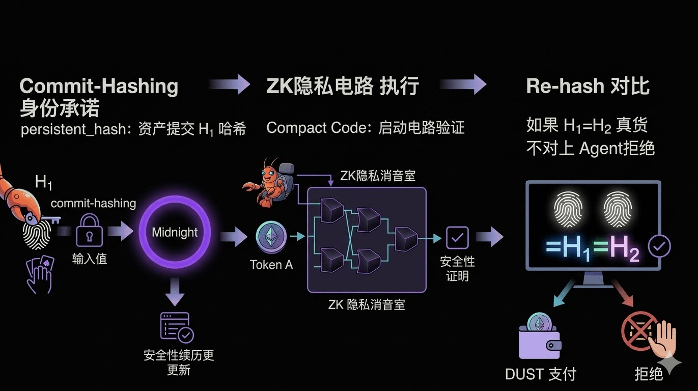Aber die Kernsprache von Midnight, Compact, hält an "Private by Default" (Standardmäßig privat) fest. Während dein Agent arbeitet, sind seine Entscheidungslogik, Vergleichsparameter und sogar seine Geheimkarten in den "Black Box"-Zero-Knowledge-Proofs (ZK) eingeschlossen. Außenstehende können nur sehen, dass er Aufgaben ausführt, aber nicht seine "Geheimnisse" durchdringen.