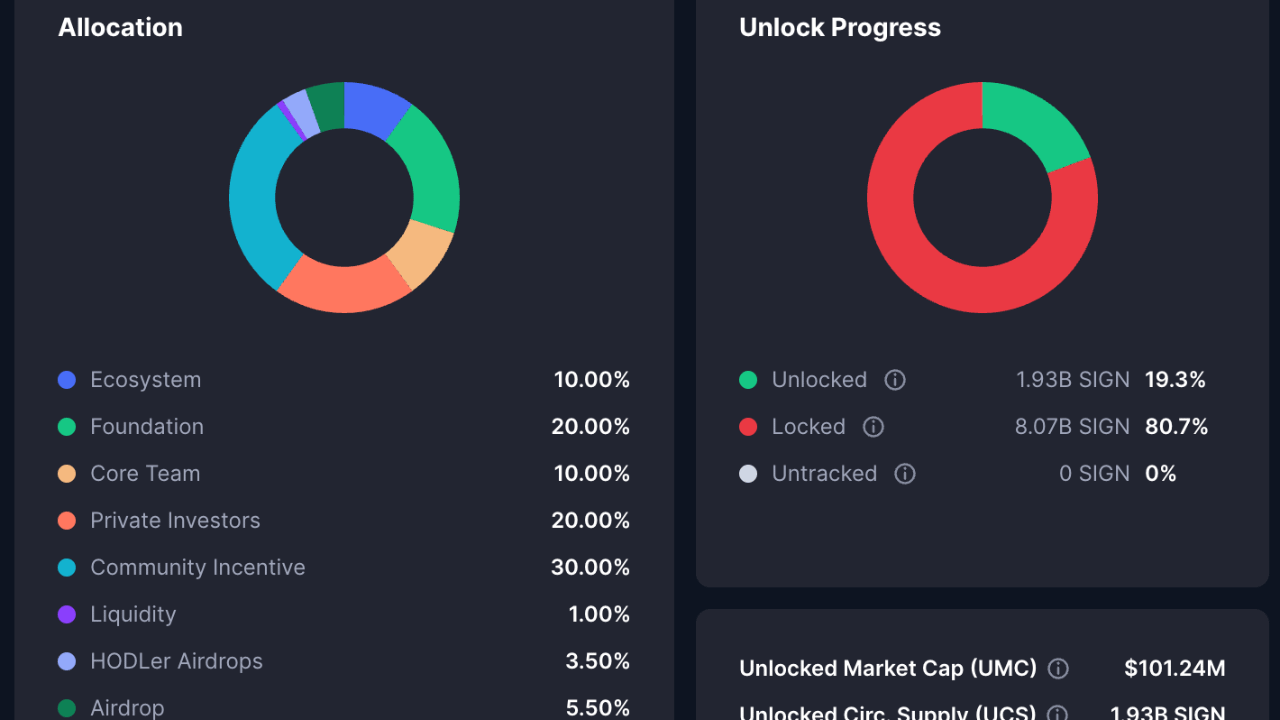I've watched $SIGN move through its cycles without much noise. Price sits around $0.05 today, give or take a few cents depending on the hour. Circulating supply holds steady at 1.64 billion out of 10 billion total. That's roughly 16.4% exposed to the market. Market cap lands in the mid-80s million range, FDV pushes toward 520-530 million. Compared to the September 2025 peak near $0.13, the drawdown is clear on any chart. Numbers don't lie.
