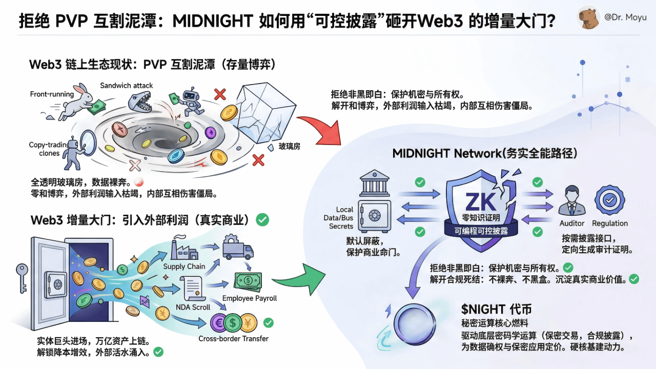 如果你在 Web3 这个圈子里待得足够久,哪怕是一个坚定的玩家,最近大概率也会感到一丝疲惫。现在的链上生态越来越像一个极度内卷的 PVP 泥潭。极高的透明度不仅没有带来真正的商业繁荣,反而滋生了无数的抢跑机器人、夹子攻击和跟单克隆。在这个全透明的玻璃房里,参与者的心力都被消耗在无休止的零和博弈中。没有外部真实的利润输入,整个行业都在存量资金里互相撕咬。