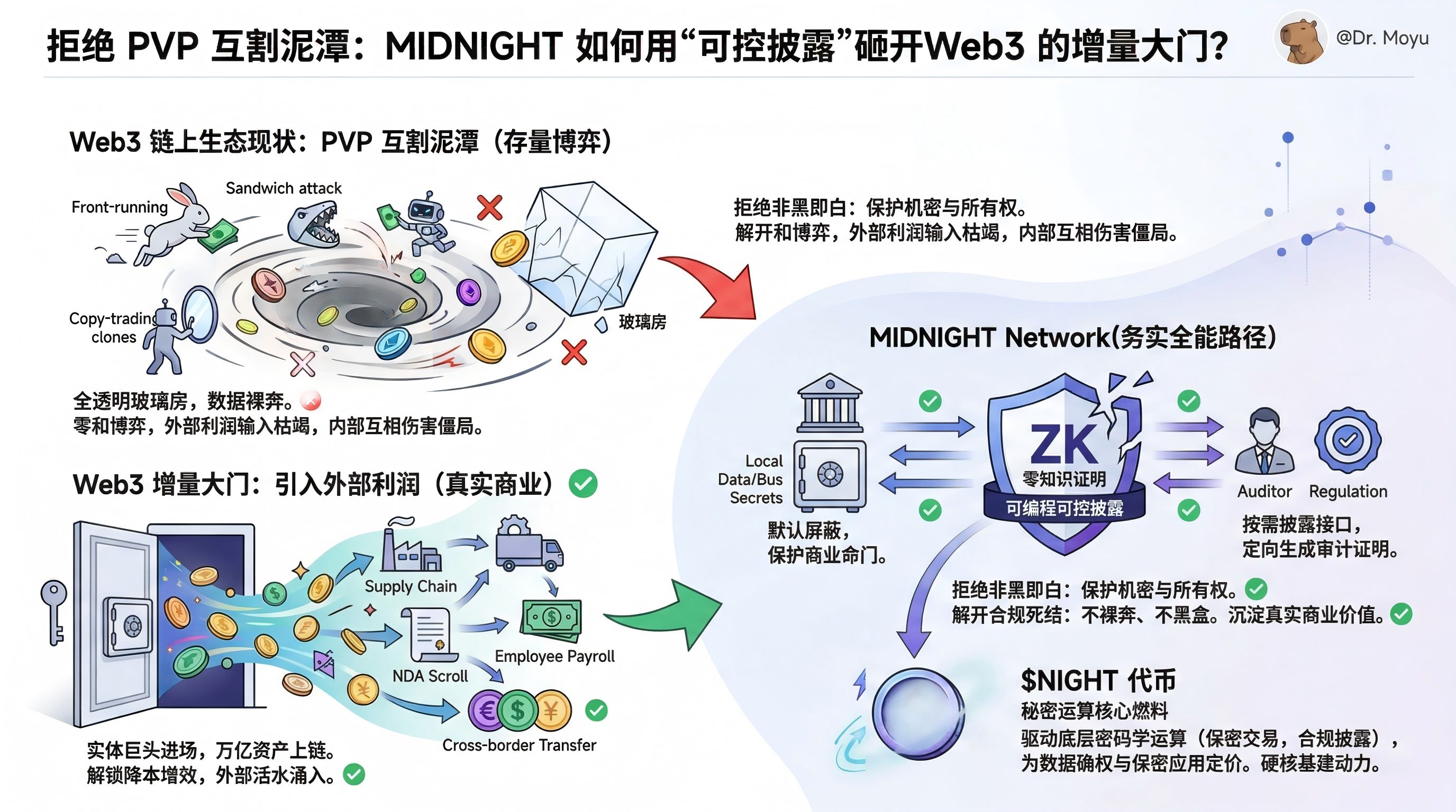 Midnight Network @MidnightNetwork 的底层设计,本质上是在向这种畸形的纯透明生态宣战,它试图为 Web3 砸开一扇引入真实增量活水的大门。Midnight 并没有去死磕单纯的 TPS 扩容,而是通过零知识证明(ZK)技术,在公链上硬生生撕开了一个“可控隐私”的安全区。它允许企业把核心业务数据锁在本地,只把一个数学上无法篡改的“验证证明”丢到链上进行网络共识。