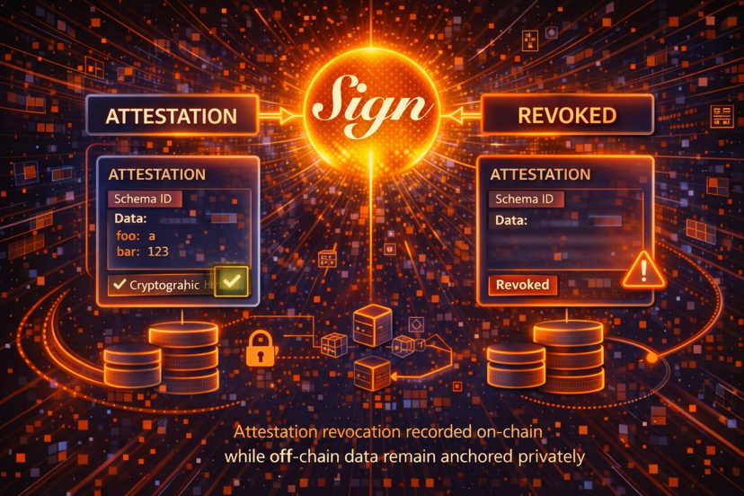 Das Widerrufs-System ist es wert, sorgfältig verstanden zu werden, da es direkt relevant dafür ist, wie Berechtigungen in Live-Deployments funktionieren. Sign unterstützt Widerruf auf der Ebene der Bestätigung, was bedeutet, dass ein Aussteller eine spezifische Bestätigung widerrufen kann, nachdem sie erstellt wurde. Der Widerruf wird on-chain aufgezeichnet und ist über SignScan abfragbar. Für ein nationales Identitäts-Deployment ist dies der Mechanismus, der Situationen wie das Aussetzen einer Berufslizenz, das Ablaufen einer Berechtigungszertifizierung oder das Zurückziehen einer Compliance-Zertifizierung behandelt. Der Widerruf löscht die ursprüngliche Bestätigung nicht. Er kennzeichnet sie als widerrufen auf eine Weise, die jeder Prüfer, der den aktuellen Status überprüft, erkennen wird.