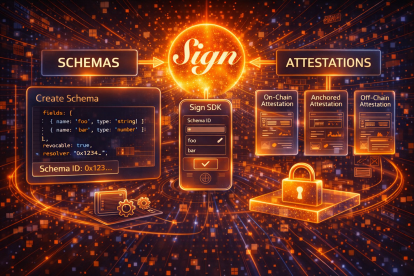 Die Erstellung eines Schemas über das Sign-SDK scheint in der Dokumentation unkompliziert zu sein. Sie definieren die Feldnamen und ihre Datentypen, geben an, ob das Schema widerrufbar ist, setzen eine Resolver-Adresse, falls Sie benutzerdefinierte on-chain-Logik benötigen, die ausgeführt wird, wenn Bestätigungen, die auf dieses Schema verweisen, erstellt oder widerrufen werden, und registrieren es. Das Schema erhält eine on-chain-ID, die jede Bestätigung, die darauf verweist, tragen wird. Diese ID ist es, die Bestätigungen strukturell vergleichbar macht, wenn verschiedene Aussteller dasselbe Schema verwenden. Zwei verschiedene Regierungsbehörden können Berechtigungen unter Verwendung derselben Schema-ID ausstellen, und ein Prüfer kann sie über eine einzige Schnittstelle vergleichen und abfragen.