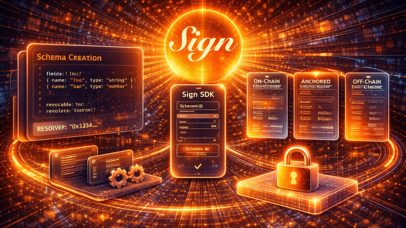 Die Grundlage von allem im Sign-Protokoll ist das Schema. Ein Schema ist eine Vorlage, die definiert, wie strukturierte Daten in einer Bestätigung dargestellt werden. Bevor Sie eine Bestätigung erstellen können, benötigen Sie entweder ein bestehendes Schema, das zu Ihrem Anwendungsfall passt, oder Sie müssen ein neues erstellen. Die Dokumentation von Sign beschreibt Schemata als on-chain registriert, was bedeutet, dass sie eine eindeutige Kennung, eine definierte Feldstruktur und einen Resolver haben, der behandelt, wie das Schema während der Verifizierung interpretiert wird.