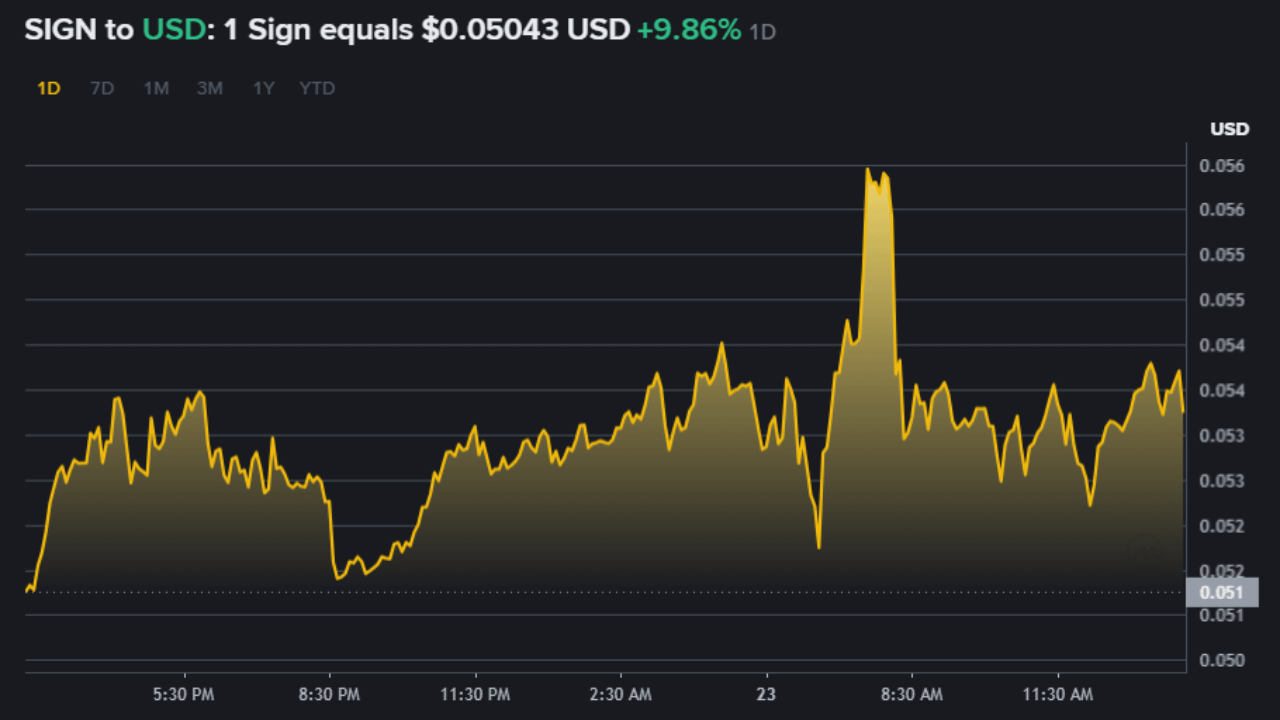 $SIGN ist $0.05043 USD heute. Marktkapitalisierung $82.71M, 1.64B im Umlauf von 10B max. 76% unter ATH, heute 23. März 2026.sign-Marktanalyse hier klicken