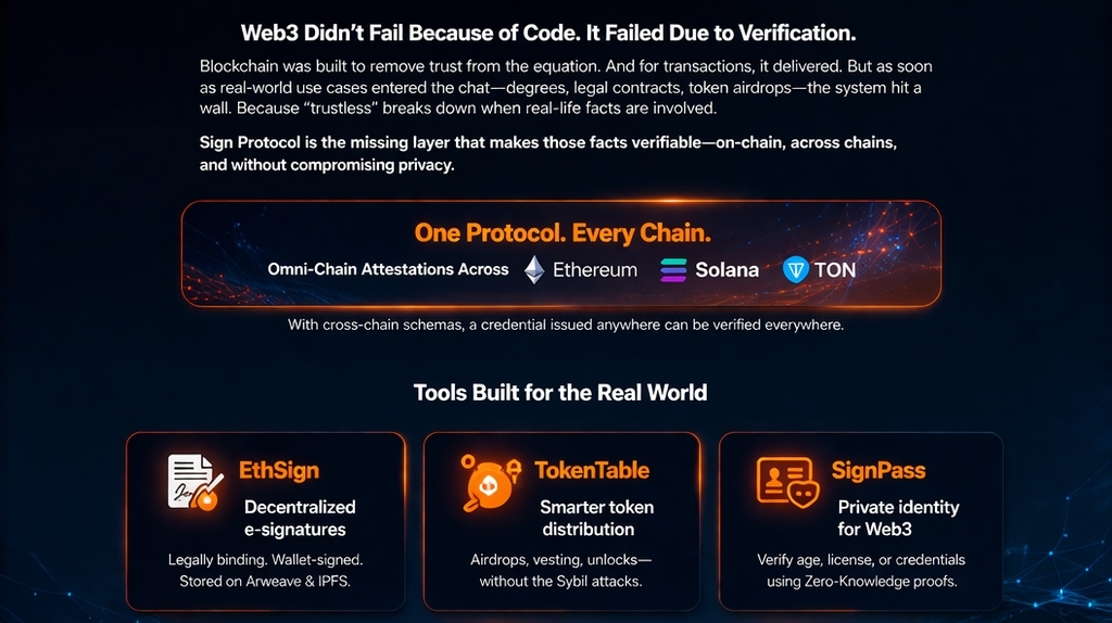 Was Sign auszeichnet, ist sein Omni-Chain-Design. Die meisten Blockchain-Tools leben in einem Netzwerk und bleiben dort. Sign tut das nicht. Es funktioniert über große Ökosysteme wie Ethereum, Solana und TON hinweg, wodurch Daten frei verschoben werden können, ohne ihre Bedeutung zu verlieren. Durch strukturierte „Schemas“ wird sichergestellt, dass ein in einem Ort erstelltes Credential überall verstanden werden kann. Einfach gesagt, es ist wie ein digitaler Reisepass, der im gesamten Internet funktioniert – nicht nur auf einer Plattform.