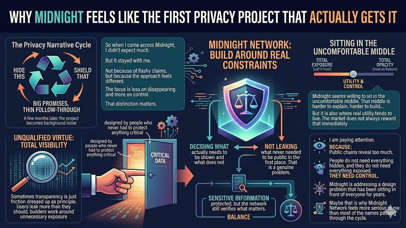 Nicht das Branding. Nicht die Aufregung. Nur die Tatsache, dass das Problem real ist. Öffentliche Ketten zeigen zu viel. Das ist es. Die Menschen können weiterhin so tun, als wäre es anders, aber jeder, der genug Zeit in diesem Raum verbracht hat, weiß, dass die Reibung da ist. Midnight sieht aus wie eines der wenigen Projekte, die tatsächlich versuchen, diese Reibung zu reduzieren, anstatt neue Schichten von Lärm darüber zu legen.