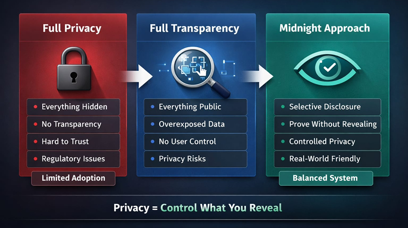 Hier nimmt Midnight eine andere Richtung ein, und ehrlich gesagt, das ist es, was mich dazu gebracht hat, die gesamte Privatsphäre-Diskussion neu zu überdenken. Anstatt zwischen Transparenz und Geheimhaltung zu wählen, konzentriert es sich auf Kontrolle.
