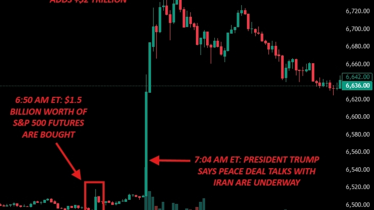 "À 6 h 50 ce matin (le 23 mars), 1,5 milliard de dollars de contrats à terme sur le S&P 500 ont été achetés. Ce trade était si massif qu’il a enclenché une hausse de 0,3 % de cet indice. Puis, 14 minutes plus tard, à 7 h 04, le président Trump a annoncé que des « discussions productives » avec l’Iran étaient en cours."Kobeissi Letter