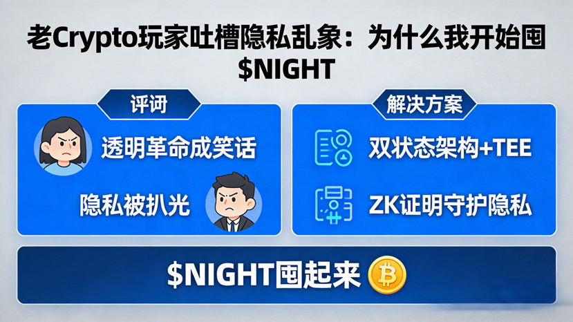兄弟们,昨天半夜刷链上数据的时候,我突然被气笑了。随便挑个热门钱包地址一查,交易历史、持仓、甚至关联的DEX交互全曝光。十年前我刚入圈那会儿,还觉得这叫“透明革命”,现在看来纯属笑话——我们喊着去中心化,结果活成了大数据眼里的透明人。谁家地址一漏,现实生活都得跟着遭殃。我玩了这么多年,见过太多项目把隐私当噱头,实际要么黑箱要么监管一碰就趴。直到盯上@MidnightNetwork 和$NIGHT,才觉得终于有个靠谱的解法。