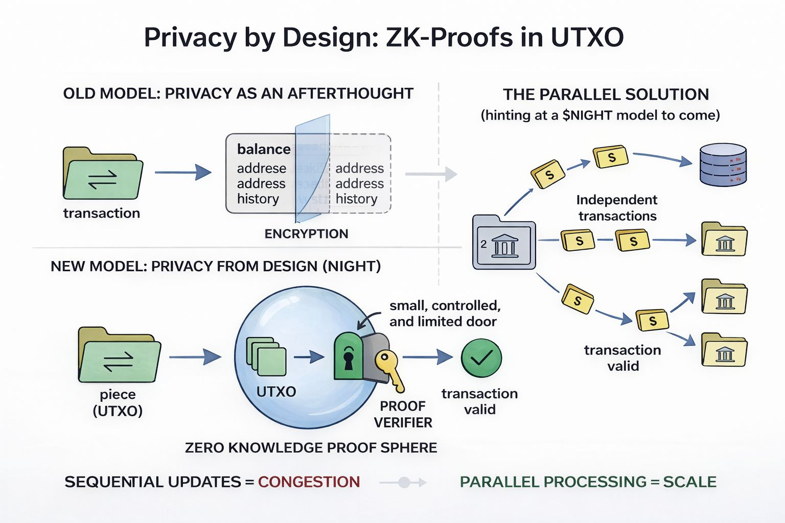 Lange Zeit dachte ich, das seien nur Kompromisse der Dezentralisierung. Aber jetzt beginne ich zu denken, dass sie Konsequenzen der Wahl des falschen Fundaments sind. Warum ich das für falsch halte, liegt daran, dass @MidnightNetwork dies aus einem völlig anderen Blickwinkel betrachtet und ehrlich gesagt hat es eine Weile gedauert, bis ich vollständig begriffen habe, warum es wichtig ist. Denn es beginnt nicht mit Konten. Es beginnt mit Ausgaben. Im Mitternachtsnetzwerk wird der Wert nicht als Saldo gespeichert, der an Ihre Identität gebunden ist. Er existiert als diskrete Teile als UTXOs. Wenn Sie ausgeben, aktualisieren Sie nichts global. Sie konsumieren ein Stück und erstellen neue. Denn hier gibt es kein gemeinsames Guthaben und keinen einzigen Zustand, der als einfach Transaktionen neu geschrieben wird.
