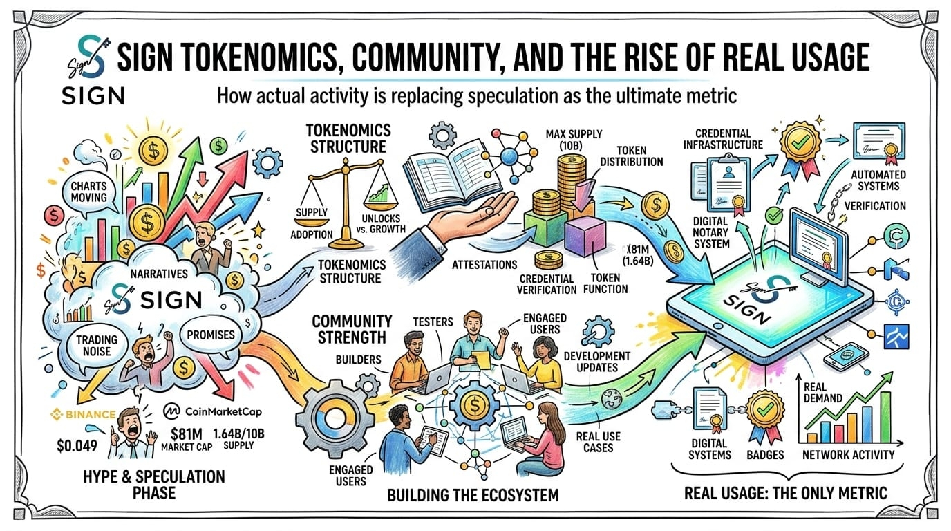 I’ve been thinking a lot lately about the moment when a crypto project stops being just an idea and starts becoming something real. Not hype, not speculation, not just charts moving up and down — but actual usage. For me, that moment started to feel real with SIGN, especially when I began looking deeper into the tokenomics, the community behavior, and how the ecosystem is slowly shifting from promises to activity.
