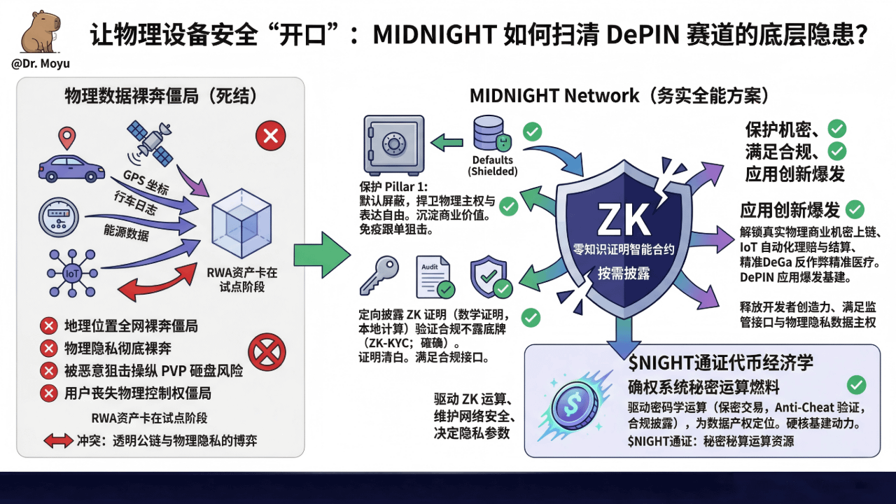Midnight Network @MidnightNetwork s technischer Einstiegspunkt kann perfekt die tödlichen Schwächen dieser Bahn ausgleichen. Basierend auf seiner zugrunde liegenden programmierbaren Zero-Knowledge-Beweis (ZK)-Architektur ermöglicht Midnight, dass physische Geräte "Daten verfügbar, aber unsichtbar" machen.