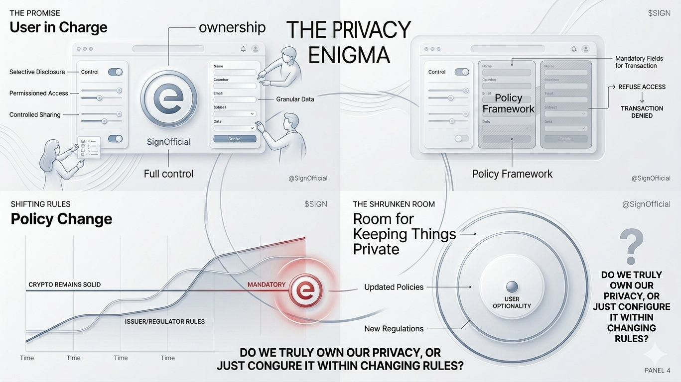 Systeme wie @SignOfficial vermitteln auf dem Papier den Eindruck, dass Datenschutz konfigurierbar ist. Man erhält selektive Offenlegung, berechtigungsbasierten Zugriff und kontrollierte Weitergabe. Man entscheidet, was, wann und wem man etwas mitteilt. Es fühlt sich fast so an, als ob der Nutzer die Kontrolle über seine eigenen Daten hätte.