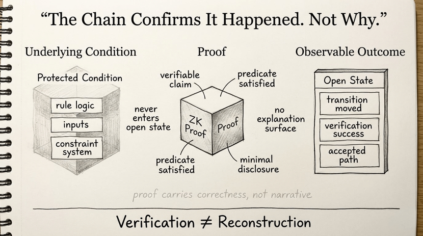 most of the time that’s enough. systems run, accepted paths move, no leaks, everything looks smooth.maybe too smooth.because older systems had this ugly advantage where you could eventually reconstruct what happened from the chain itself. here you can’t. not because it’s hidden poorly,