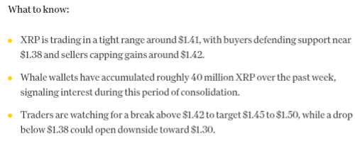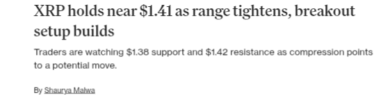 XRP is currently trading near the $1.41 level, and the market is showing a classic compression setup. Price is moving in a tight range between $1.38 support and $1.42 resistance, which usually means a big move is coming soon. When price squeezes like this, it often leads to a strong breakout in one direction. đ