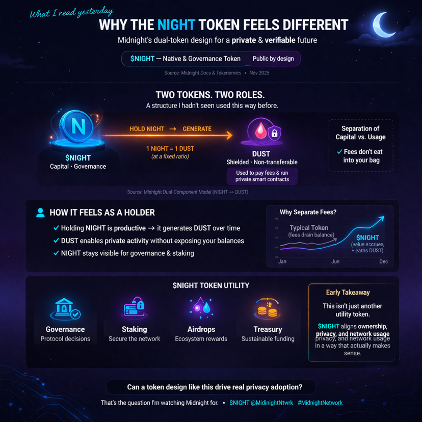 Gestern habe ich etwas Zeit damit verbracht, über Midnight zu lesen, und was mir im Gedächtnis geblieben ist, war nicht nur die Erzählung über Privatsphäre. Es war das Token-Design dahinter. Viele Krypto-Token fühlen sich leicht zu erklären an: Sie sind hauptsächlich für Gas, Spekulation oder Governance. NIGHT fühlte sich für mich nicht so einfach an. Midnight beschreibt NIGHT als das ungeschützte native und Governance-Token des Netzwerks, während DUST die geschützte, nicht übertragbare Ressource ist, die zur Durchführung von Transaktionen und der Ausführung von Smart Contracts verwendet wird. Diese Trennung ließ das gesamte System sofort viel überlegter erscheinen.