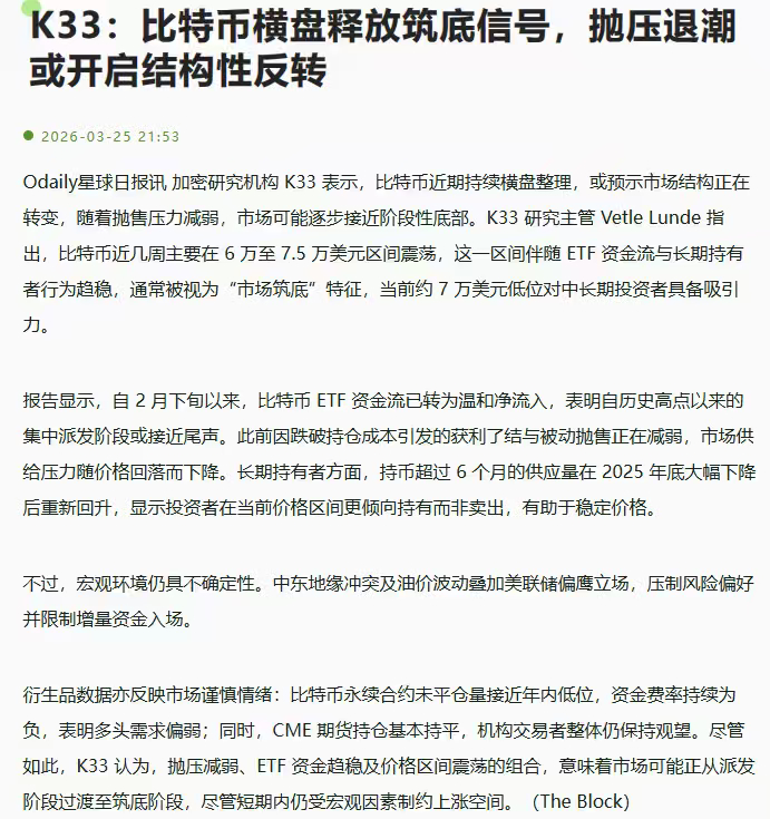 Heute fasse ich den Forschungsbericht von K33 zusammen: Bitcoin, der sich im Bereich von 60.000 bis 75.000 USD seitwärts bewegt, ist kein Zeichen für eine Schwächung des Marktes, sondern ein Signal für die Bildung eines Bodens, da der Verkaufsdruck allmählich nachlässt. Der Markt wechselt von der Verteilungsphase zur Bodenbildung und es ist sehr wahrscheinlich, dass eine strukturelle Umkehr bevorsteht.#BTC