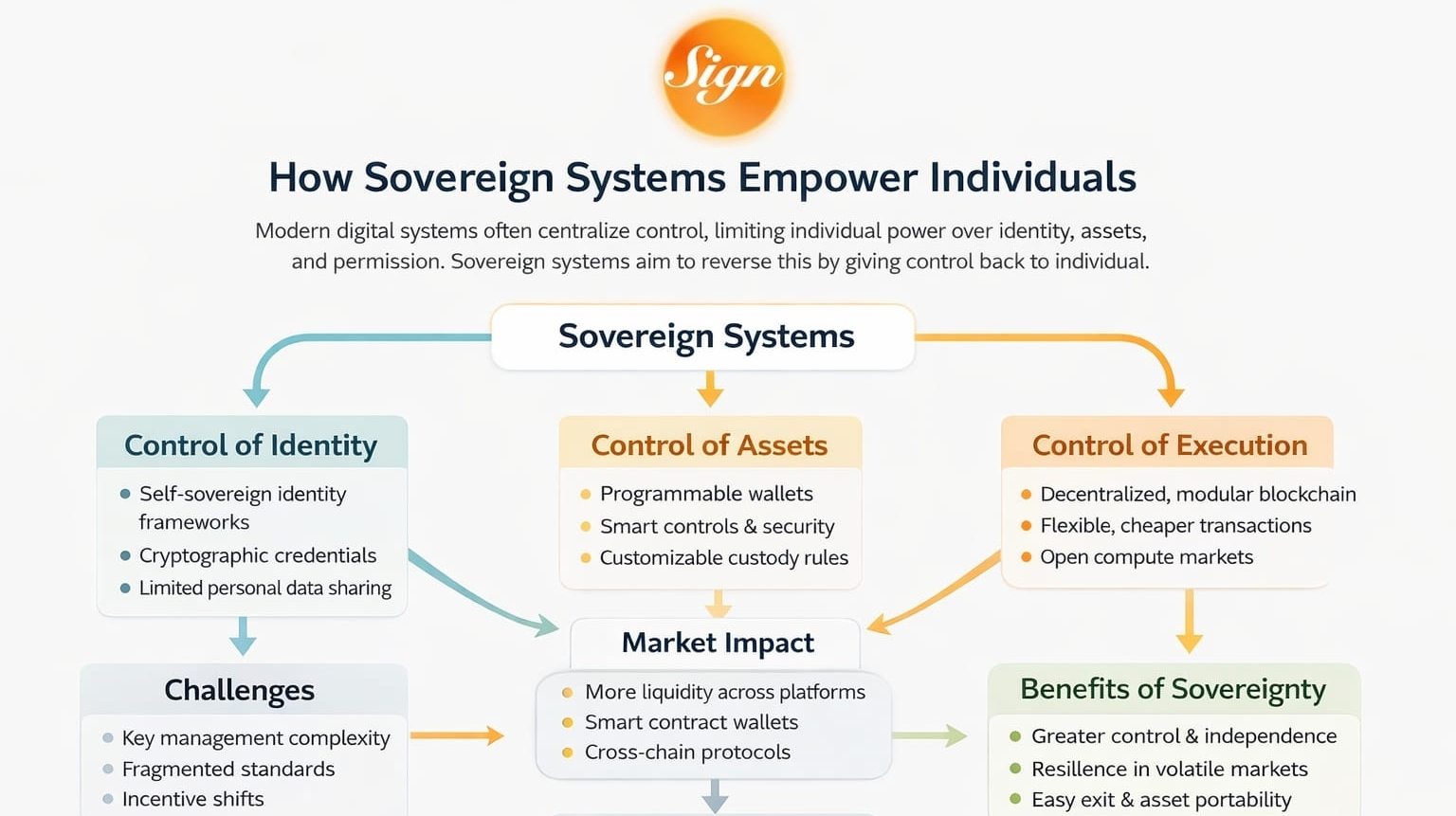 Moderne digitale Systeme laufen leise im Hintergrund und bestimmen, wer Macht hat, oft ohne dass wir es überhaupt bemerken. Jedes Mal, wenn Sie sich irgendwo anmelden, eine Transaktion durchführen oder beweisen, wer Sie sind, gibt es normalerweise einen Vermittler, der entscheidet, wer eintreten darf, was erlaubt ist und wie der Wert fließt. Das Problem ist nicht nur, dass diese Systeme zentralisiert sind. Es ist, dass das Machtverhältnis stark kippt: Sie erstellen all diese Daten, aber Institutionen dürfen sie überprüfen, bewegen und davon profitieren. Souveräne Systeme zielen darauf ab, dieses Skript umzudrehen. Sie geben die Kontrolle über Identität, Vermögenswerte und Berechtigungen an den Einzelnen zurück.