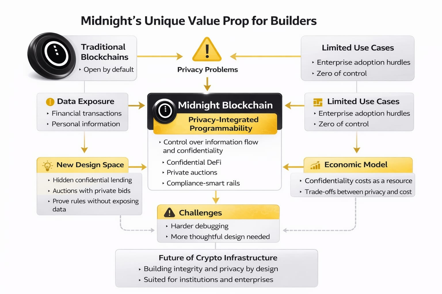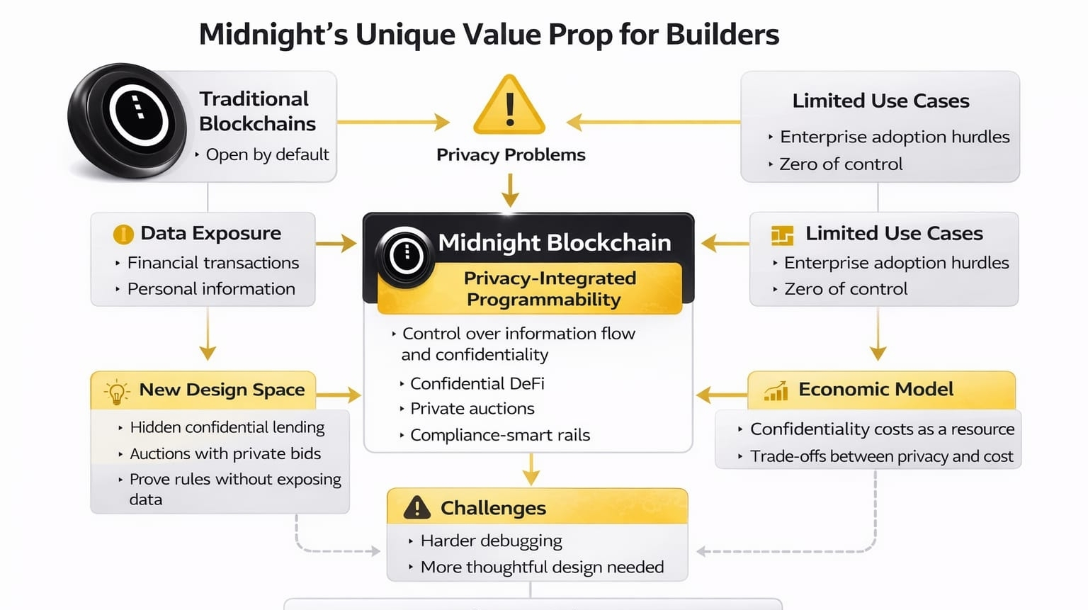 Wenn man Midnight als Entwickler betrachtet, sieht man nicht nur eine weitere Blockchain, die versucht, Gebühren zu senken oder die Geschwindigkeit zu erhöhen. Was heraussticht, ist, wie es „Programmierbarkeit“ neu definiert. Die meisten Ketten erlauben es Ihnen, Regeln zu schreiben, die entscheiden, was der Code tut, und standardmäßig ist alles für jeden einsehbar. Bei Midnight ist das nicht der Fall. Hier liegt die wahre Macht im Programmieren, wo Informationen fließen und wo sie enthalten sind.