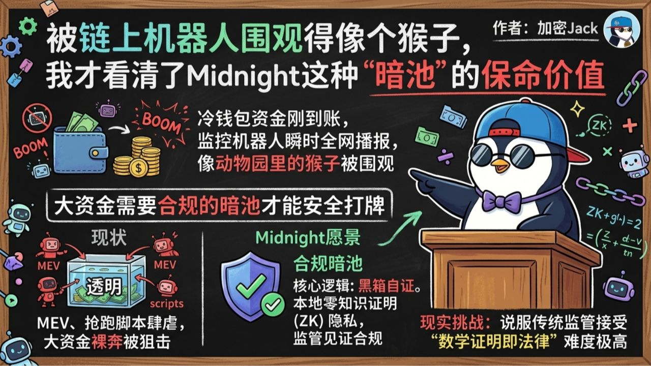 现在的区块链隐私完全是虚无的,容易被洗钱盯上,要么就是“裸奔”,让机构没法玩。Midnight的核心就是用密码学给你发一张“良民证”。它让你能在本地证明你的资金来源合法、通过了KYC,然后拿着这个凭证去链上交互。监管方能看到他们需要的合规数据,而那些想跟着你喝汤、想狙击你的散户和脚本,看到的只是一个毫无意义的哈希值。