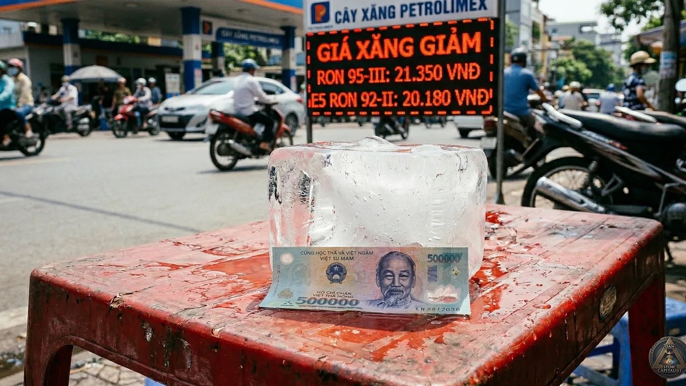Der Eisblock schmilzt und bringt ein sofortiges Gefühl der Frische, genau wie die Medien dich mit ein paar makroökonomischen Nachrichten beruhigen. Doch direkt unter dieser künstlichen Frische ertrinkt heimlich dein 500.000 VNĐ-Schein und macht ihn unwirksam. Strukturelle Inflation stiehlt kein Geld aus deiner Brieftasche, sie lässt deine Kaufkraft direkt vor deinen Augen schmelzen, legal und sanft.
