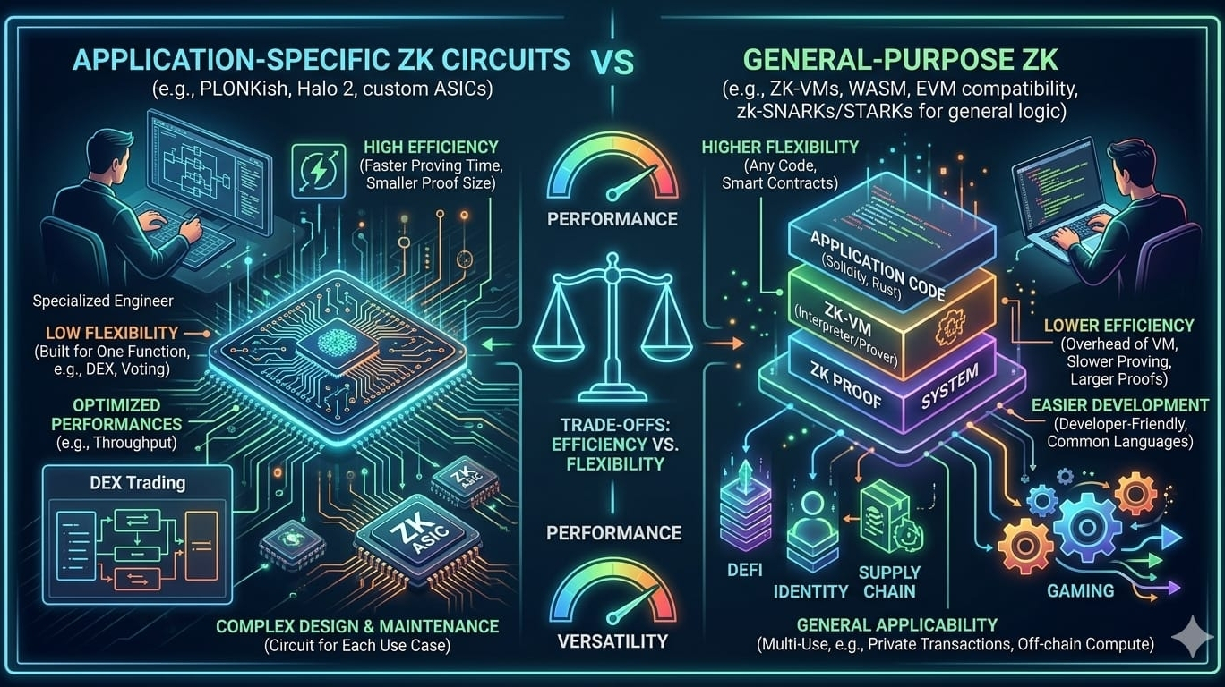 Allgemeine ZK-Systeme verfolgen den entgegengesetzten Ansatz. Sie zielen darauf ab, universell zu sein – in der Lage, mehrere Anwendungen mit derselben zugrunde liegenden Struktur zu handhaben. Dies macht sie leistungsstark für Entwickler, die experimentieren oder in verschiedenen Bereichen bauen möchten, ohne alles von Grund auf neu zu gestalten.