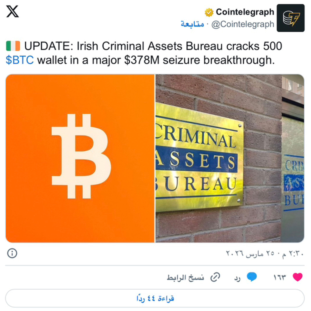• فتحت السلطات الإيرلندية محفظة بيتكوين تحتوي على 378 مليون دولار.