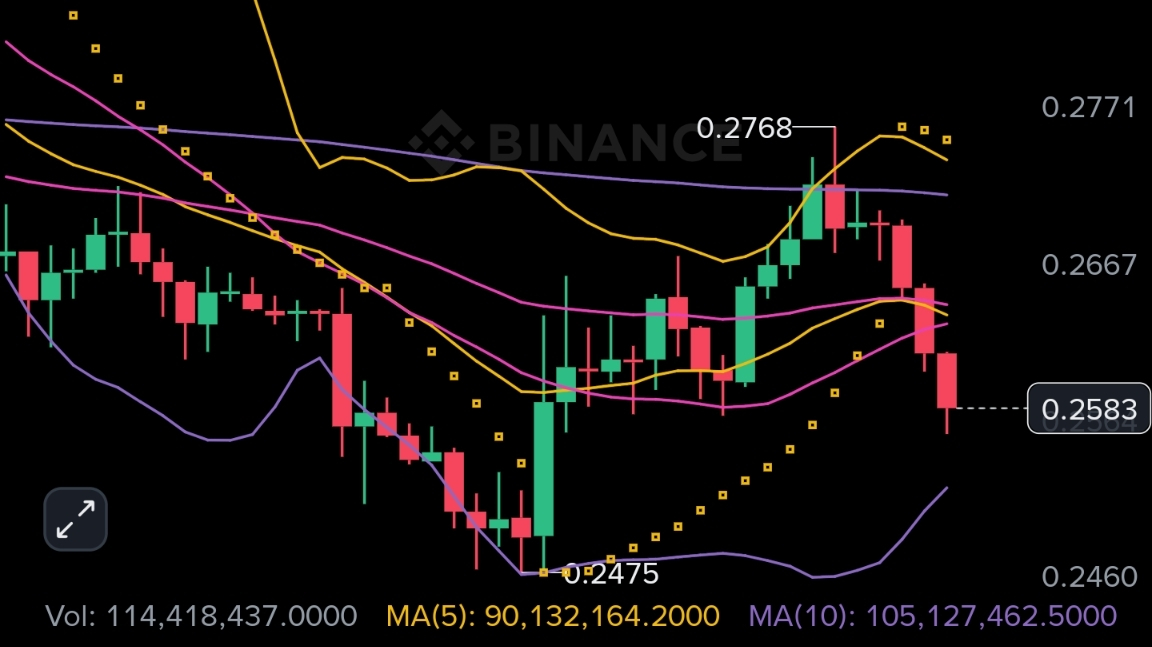 Der tägliche Kurs war monatelang in einem bärischen Bereich gefangen, der Preis liegt unter EMA20 bei 0.2665 und EMA50 bei 0.2820, SAR darüber bei 0.2891 und OBV bei negativ 8.94 Milliarden zeigt kein Zeichen von Akkumulation. H4 hat 0.2768 abgelehnt und ist seitdem wieder unter den gesamten EMA-Cluster zwischen 0.2644 und 0.2723 gefallen, mit SAR darüber bei 0.2759 und OBV, der weiterhin blutet, der Rückprall von 0.2475 verliert bereits Energie. H1 StochRSI bei 4.57 bereitet einen kurzen Erholungsdrang zurück in die Angebotszone von 0.2630 bis 0.2660 vor, wo der H1 EMA-Cluster und H4 BOLL-Mittelband bei 0.2638 zusammenlaufen, und genau dort wartet dieser Short-Einstieg. Haupts Risiko ist, dass H4 StochRSI ebenfalls nah an einstellig ist, sodass jede breite Marktbewegung diesen Druck auf 0.2759 drücken könnte, bevor die Verkäufer die Kontrolle übernehmen.