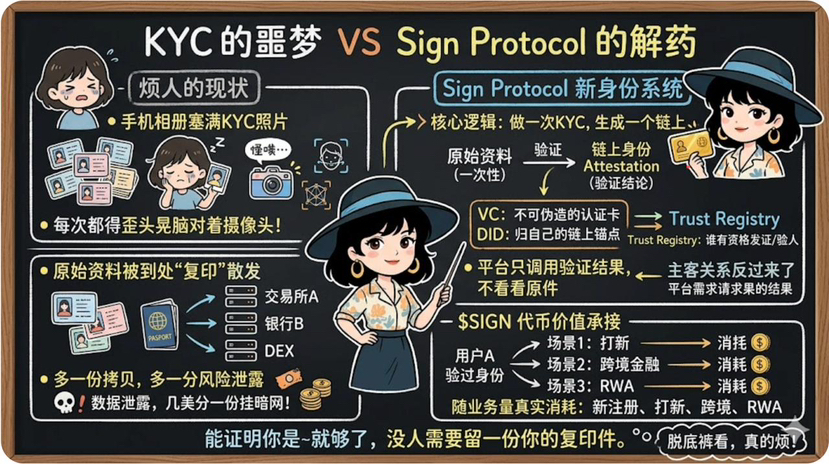 我手机相册里现在还存着那些KYC用的照片,每次翻到都觉得别扭。Sign这套体系全面落地肯定还需要时间,但至少让我看到一种可能身份验证这件事,本来就不该是把底裤脱给每个门卫看一遍才能进门。能证明你是你就够了,没人需要留一份你的复印件。