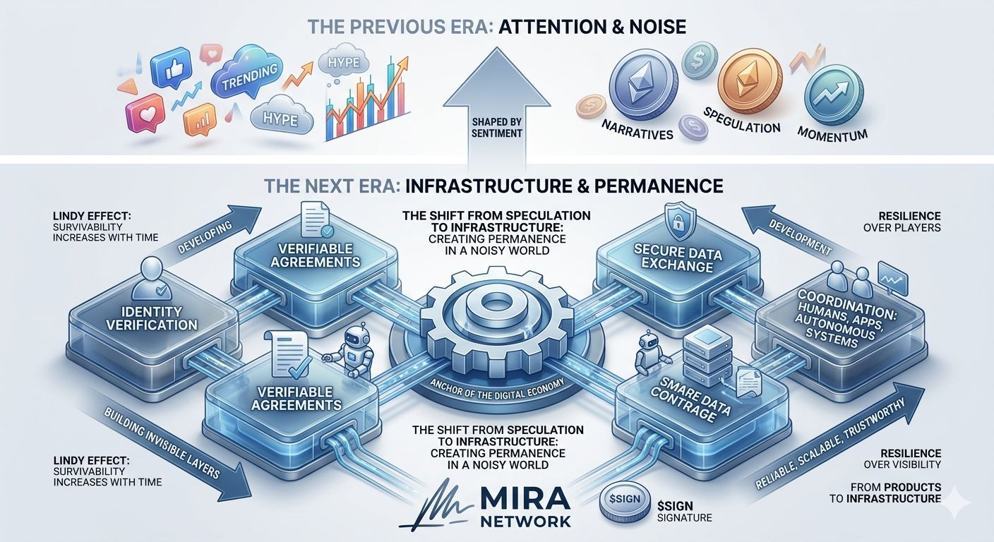 Die nächsten Gewinner sind möglicherweise nicht die Projekte, die heute die Zeitlinien dominieren. Stattdessen werden es wahrscheinlich die Netzwerke sein, die Vertrauensschichten aufbauen, die unabhängig von der Marktsituation funktionsfähig bleiben. Diese Systeme verwandeln sich von Produkten in Infrastrukturen, und sobald die Infrastruktur wesentlich wird, wird ihre Ersetzung nahezu unmöglich.