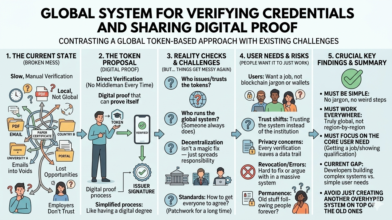 Ehrlich gesagt ist das ganze System gerade ziemlich kaputt. Das ist der Ausgangspunkt. Nicht irgendeine große Vision. Einfach ein Chaos. Du hast Abschlüsse, die nur im Land, in dem du sie erworben hast, von Bedeutung sind. Zertifikate, die Wochen zur Überprüfung brauchen. Arbeitgeber, die dem, was du ihnen sendest, nicht vertrauen. Menschen verlieren den Zugang zu Jobs, weil sie nicht beweisen können, was sie bereits wissen. Es ist dumm.