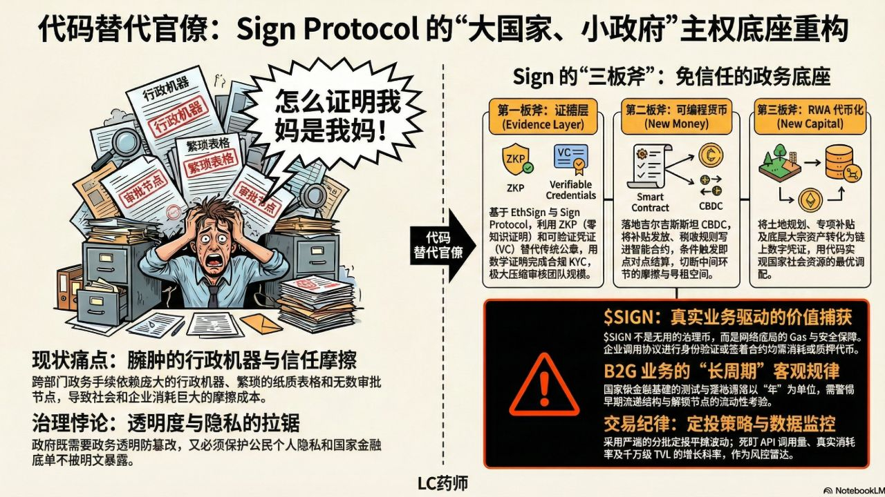 Dies ist die Kernkomponente, die die traditionellen administrativen Genehmigungen ersetzt. Früher mussten Unternehmen für die Genehmigung die Unterschriften und Stempel aller Abteilungsleiter einholen; jetzt kann dies direkt über EthSign mit rechtlich bindenden elektronischen Signaturen auf der Blockchain erfolgen; das Sign-Protokoll nutzt ZKP (Zero-Knowledge-Proofs) und verifiable credentials (VC), um die Qualifikationsprüfung unter Wahrung der Privatsphäre durchzuführen. Die Regierung muss kein riesiges Überprüfungsteam mehr unterhalten; mit einem mathematischen Beweis kann sie KYC legal und konform durchführen, was die vertrauensbasierte Grundlage für die 'kleine Regierung' bildet.