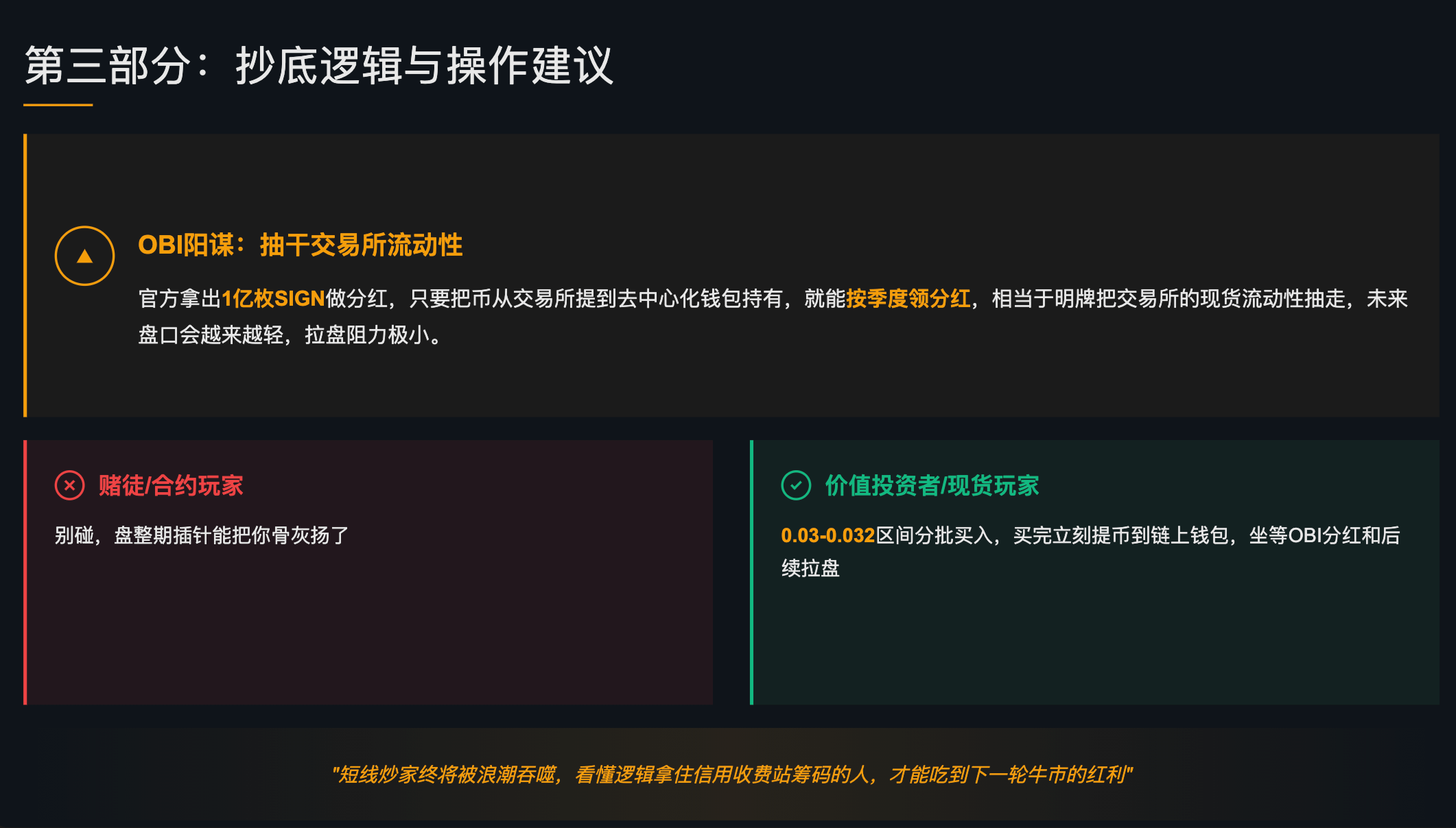 官方这是在明牌“抽干交易所的流动性”!当所有聪明的大户和长期看好者,为了拿 OBI 分红,源源不断地把币从币安这种交易所提走到链上冷钱包时,交易所里的 $SIGN 现货盘口会变得越来越薄。