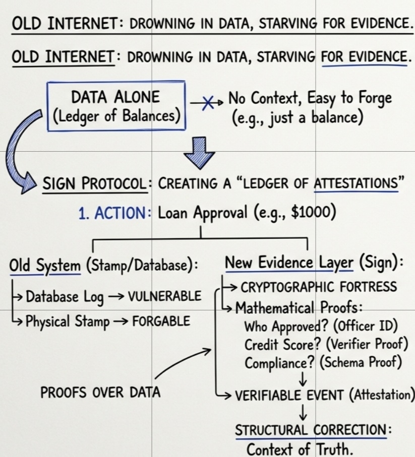 There is a profound difference between data and evidence. The internet is drowning in data, but it is starving for evidence. I observe that in our current digital economy, we have no way to prove the "Context of Truth." If a bank approves a loan, we see the transaction. But why was it approved? Who checked the credit score? Which version of the regulatory compliance code was active at that exact millisecond?