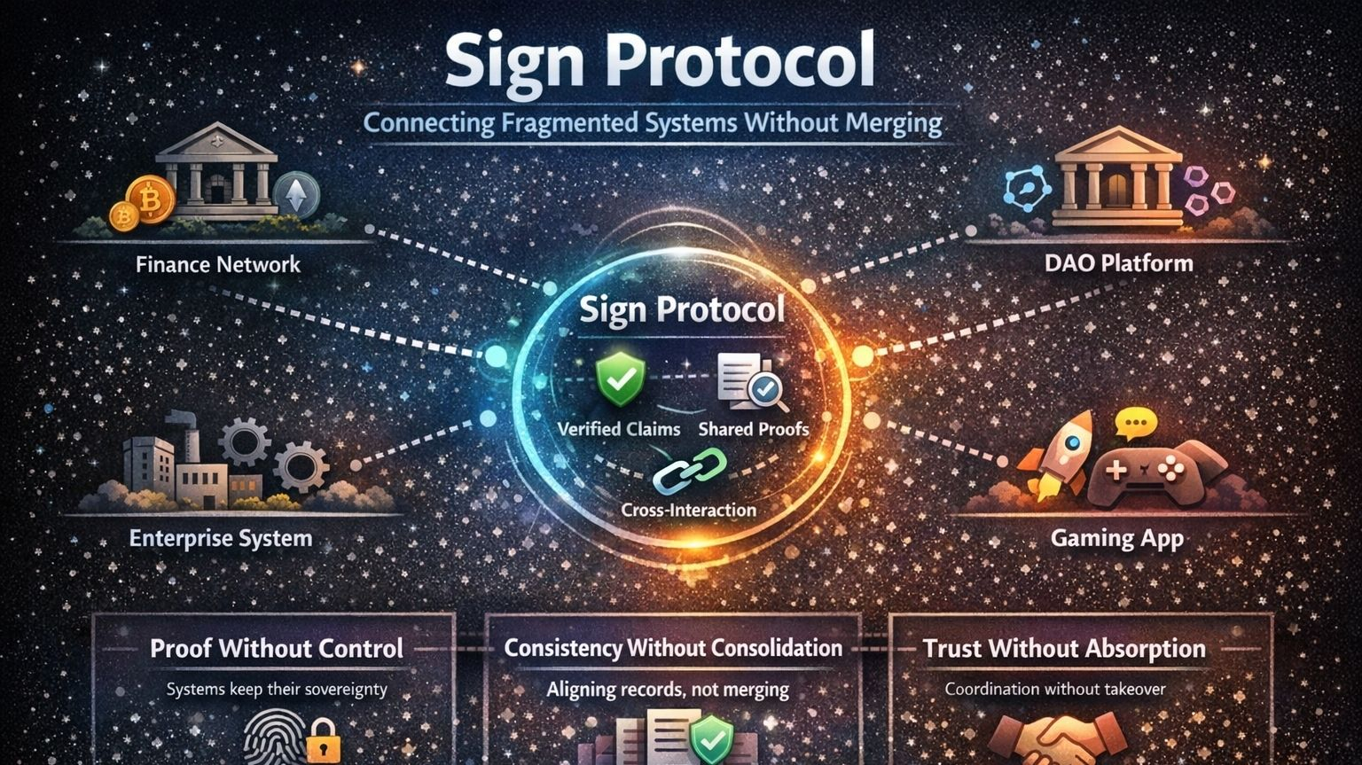 Denn das eigentliche Problem besteht nicht darin, jedes System zu einer Fusion zu bringen. Ich glaube nicht, dass das passiert, und ehrlich gesagt denke ich, dass es nicht passieren sollte. Das schwierigere Problem ist, ob separate Systeme auf etwas gemeinsam Genutztes, Verifizierbares und Dauerhaftes verweisen können, ohne ihre eigenen Grenzen im Prozess aufzugeben. Ob sie koordinieren können, ohne vorzugeben, dass sie einander vollständig vertrauen. Ob der Beweis reisen kann, auch wenn die Kontrolle nicht vorhanden ist.