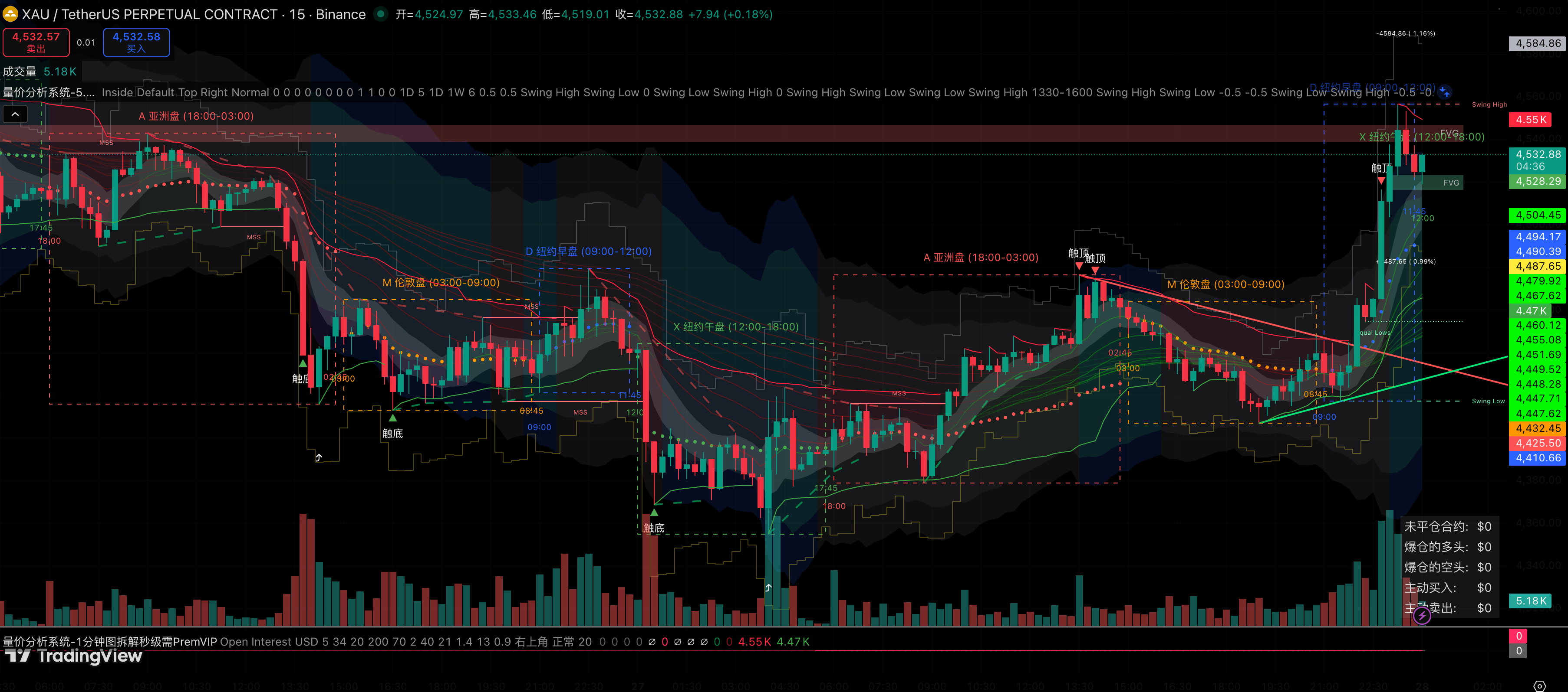 Bestätigungssignal: Wenn der Preis in diesen Bereich zurückfällt und auf dem 15-Minuten-Chart ein deutliches Stoppt-Signal erscheint (wie eine lange untere Schattenkerze oder das System erneut ein ähnliches „Boden“-grünes Dreieck anzeigt), dann entschlossen auf der rechten Seite long gehen.