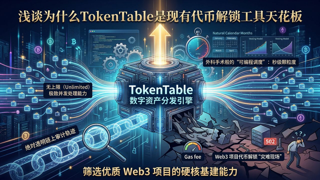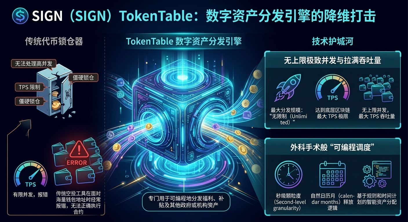 Die im @SignOfficial Whitepaper detailliert offengelegte Kernlogik des TokenTable führt zu einer drastischen Reduzierung der Unfähigkeit, hochgradige Concurrent-Tools zu verarbeiten. Es ist keineswegs ein einfaches „Token-Lockup-Tool“, sondern ein System mit hoher Durchsatzleistung, das als „digitaler Vermögensverteilungs-Engine“ definiert ist und speziell für die programmierbare Verteilung von Wohltätigkeiten, Subventionen und anderen Regierungs- oder Institutionen-Vermögenswerten entwickelt wurde. Wo genau liegt der technische Burggraben des TokenTable? Unbegrenzte extrem hohe Concurrent-Verarbeitungsfähigkeit: Traditionelle Airdrop-Verteilungstools melden häufig Fehler, wenn sie mit einer großen Anzahl von Wallet-Adressen konfrontiert werden und können den Vertrag nicht korrekt ausführen, während die maximale Verteilungsgröße des TokenTable als „unbegrenzt (Unlimited)“ konzipiert wurde. Noch beeindruckender ist, dass seine Verarbeitungsdurchsatzleistung direkt maximiert werden kann, um das maximales TPS-Limit der zugrunde liegenden Blockchain zu erreichen. Das bedeutet, dass es unabhängig von der Größe der Verteilung dem hohen Concurrent-Druck standhalten kann. Chirurgisch präzise „programmierbare Planung“: Es hat die rigide Lockup-Logik verworfen und unterstützt die intelligente Vermögensverteilung basierend auf Regeln und Zeitplänen. Die Verteilungsplanungsgenauigkeit kann nicht nur erstaunliche „Sekundenebene Granularität (Second-level granularity)“ erreichen, sondern unterstützt auch perfekt die reale Geschäftspraxis der Freigabe-Logik nach Kalendermonaten (calendar months).