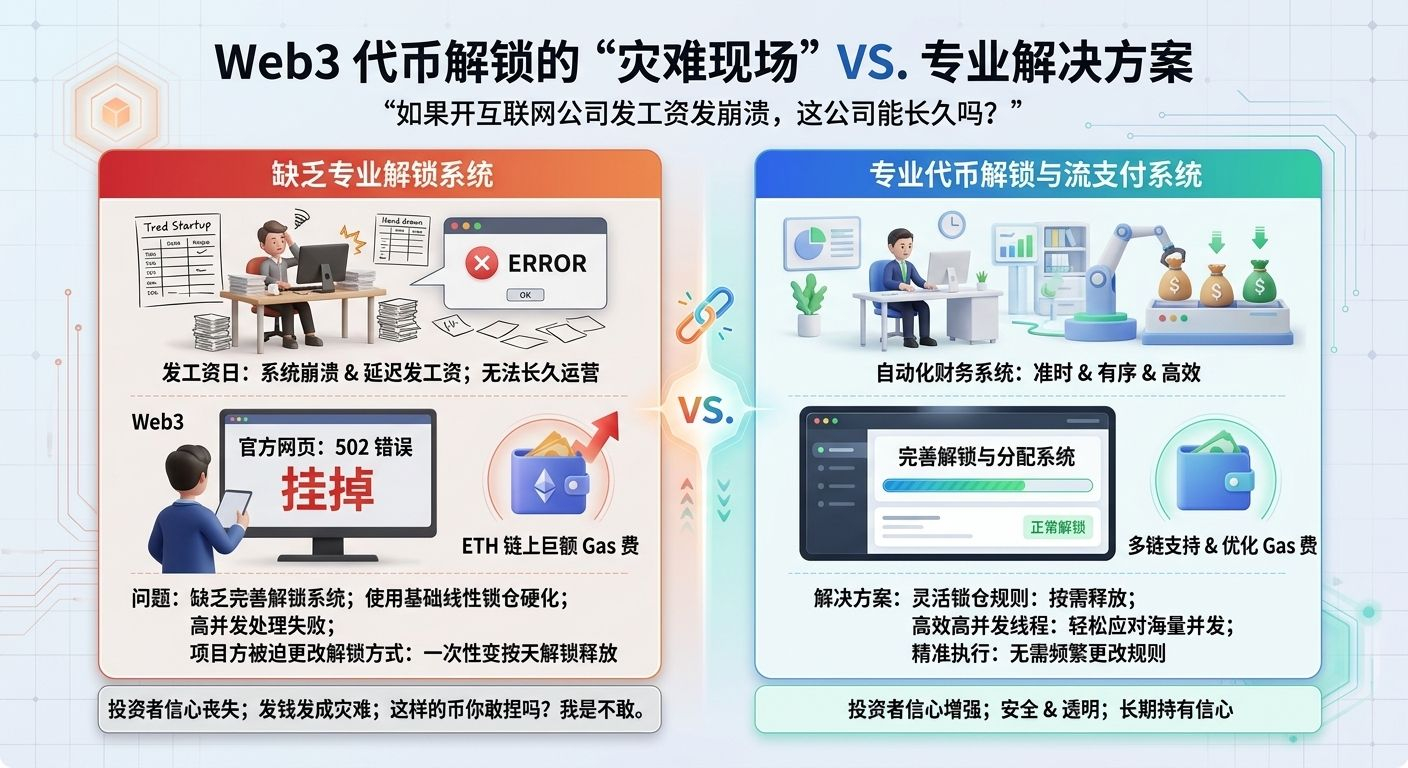 Wenn du ein Internetunternehmen gründest und weil es ein Start-up ist, dir keine Finanzen leisten kannst, was zu einem fehlenden prozessorientierten Finanzmanagementsystem führt, sodass das System jeden Monat am Gehaltstag für die Mitarbeiter zusammenbricht und es sogar zu Verzögerungen bei der Gehaltsauszahlung kommt, glaubst du, dass ein solches Unternehmen langfristig bestehen kann? Aber in der Welt von Web3 gibt es zahlreiche Beispiele für solche "Geldauszahlungen, die zu einer Katastrophe führen". Wir sehen oft, dass einige Hot-Projects bei der Durchführung von Airdrops, Knotenbelohnungen oder der Freigabe von Team-Token lediglich die grundlegendsten linearen Lockup-Smart Contracts verwenden, ohne ein umfassendes Freigabesystem. Das Ergebnis ist, dass am Freigabetag nicht nur die offizielle Frontend-Webseite direkt zu einem 502 wird, sondern wenn dieser Token-Vertrag auf der ETH-Elitekette ist, auch hohe Gasgebühren anfallen. Noch schlimmer ist, dass traditionelle Lockup-Tools oft extrem rigide Regeln haben, die nicht in der Lage sind, hochgradige Parallelverarbeitung zu bewältigen, was dazu führt, dass viele Projektteams von einmaligen Freigaben auf tägliche Freigaben umschwenken. Die Frage ist: Würdest du die Münzen eines solchen Projektes anpacken? Ich würde es nicht wagen.