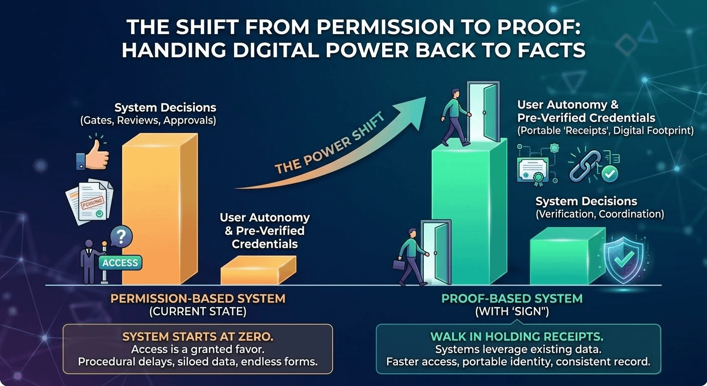 Sign nudges you in the other direction. What if your evidence could just come with you? What if your identity, what you’re eligible for, the stuff you’ve actually done, or the credentials you’ve earned didn’t get wiped clean every single time you knock on a new door? You walk in already holding the receipts. The system doesn’t have to start from zero—it just looks, checks, and lets you through.