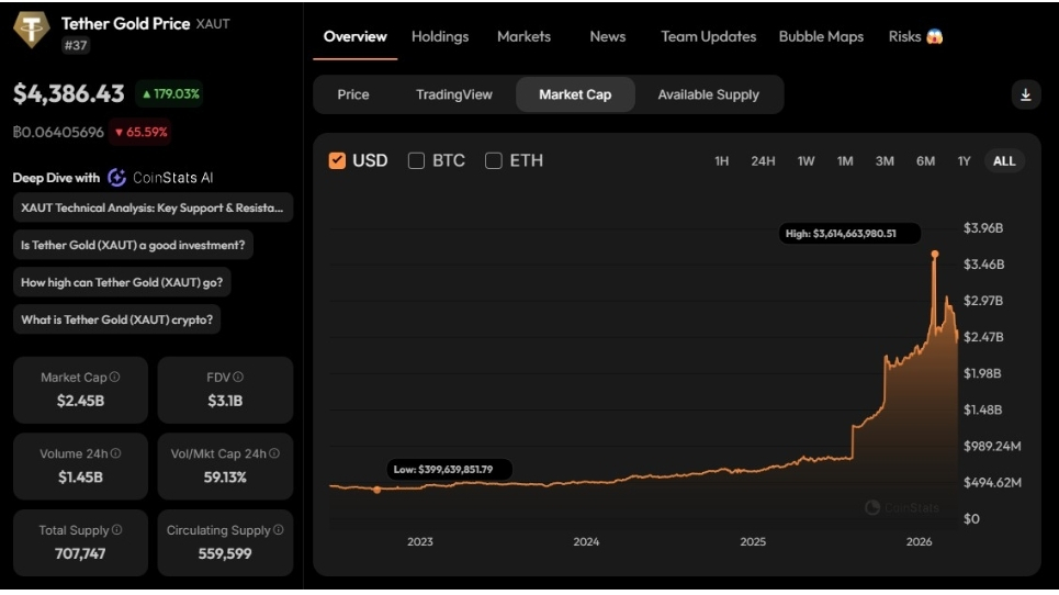 Daten von CoinStats zeigen, dass XAUT die 33. größte Kryptowährung der Welt ist, mit einem Marktwert von 2,45 Milliarden US-Dollar zum Zeitpunkt dieser Abfassung.