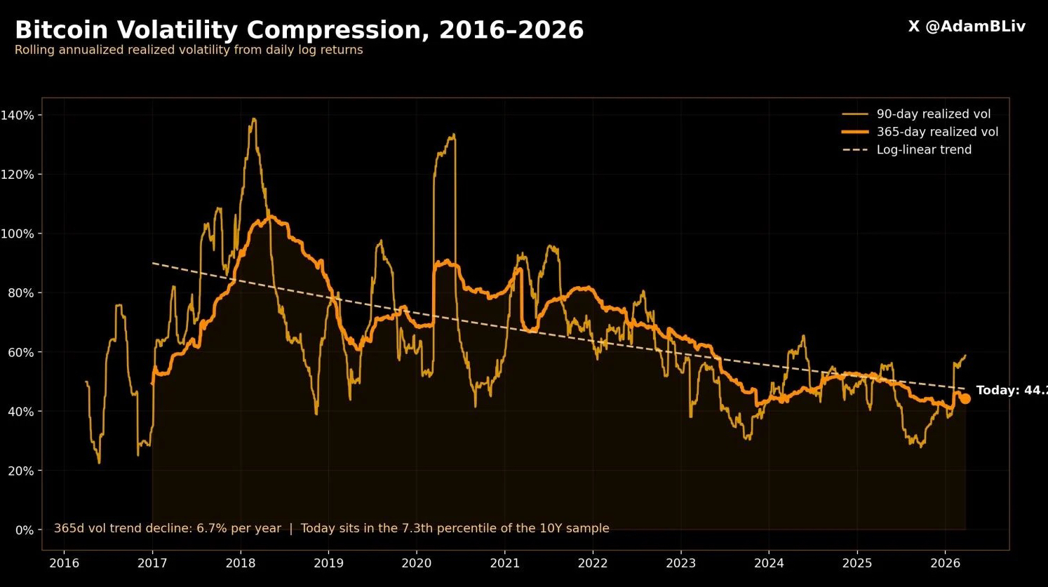 In den letzten Jahren ist die Volatilität von Bitcoin stabil gesunken. Wenn die durchschnittliche 90-Tage-Volatilität in den Jahren 2018-2019 über 77 % lag, ist sie bis 2026 auf etwa 47 % gesunken.