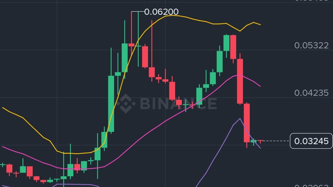 BOLL带:价格目前靠近下轨(DN 0.03081),中轨(MB 0.04490)较高,上轨0.05900,说明短期处于相对低位,波动率收窄,可能酝酿反弹或继续震荡。
