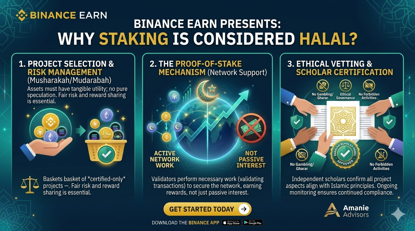 Staking im Rahmen des Binance Sharia Earn-Programms wird als halal betrachtet, da es absichtlich darauf ausgelegt ist, sich von traditionellen zinsbasierten Modellen zu entfernen und sich an den grundlegenden ethischen Säulen der islamischen Finanzen auszurichten.