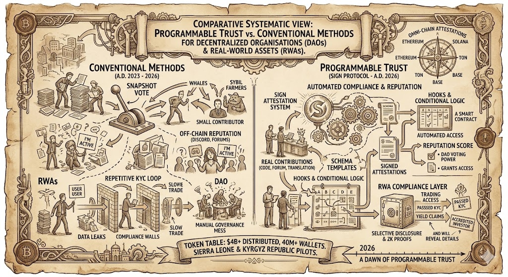 Auf dem Weg ins Jahr 2026 wird diese Materie wichtiger. DAOs verwalten ernsthaft Geld - größere Staatskassen, agentische Setups, automatisierte Ausführungen. Sie brauchen weniger Drama in der Governance und bessere Möglichkeiten, echte Arbeit gegenüber Haltern zu belohnen. RWAs drängen auf echte institutionelle Zuflüsse. Das bedeutet engere Compliance, ohne Liquidität oder Geschwindigkeit zu töten. Sign sitzt genau in der Mitte als die Schicht, die "einmal beweisen, überall verwenden" praktisch über die Ketten hinweg macht.