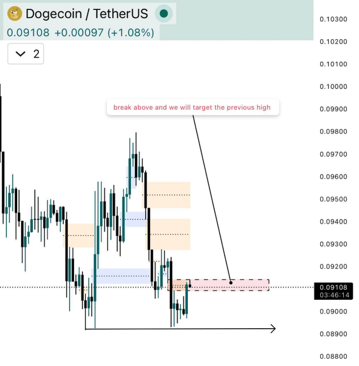 The chart shows DOGE trading around $0.091, stabilizing after a sharp drop from the $0.097-$0.098 region.