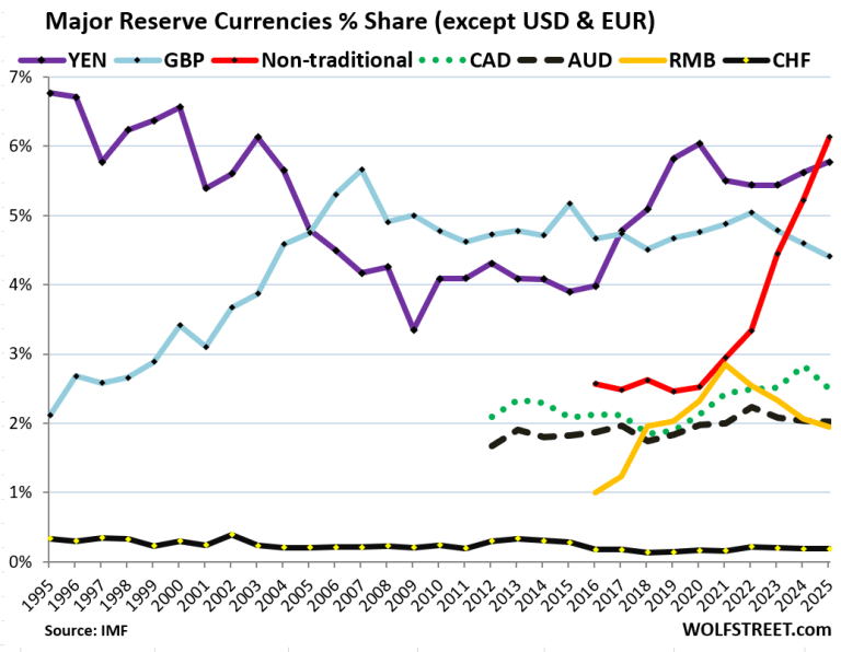 Non-Traditional Currencies: A basket of dozens of smaller currencies (excluding the majors like the Euro or Yen) now accounts for 6.1% of reserves, surpassing the Japanese Yen.